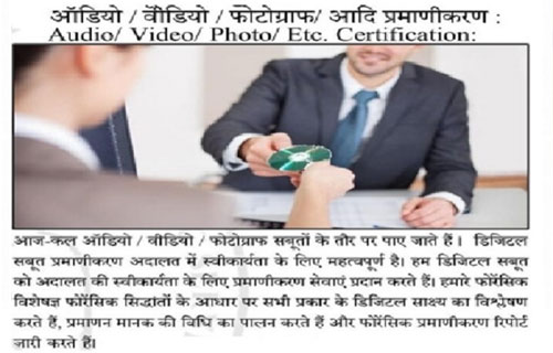 Now a day’s audio video photograph is the mostly found evidences. Where this evidence authentication is very important for admissibility in the court of law. International Forensic Laboratory provide the audio, video and photographs certification services for the court admissibility of such evidences. Audio video photo 65B certification certificationof IEA or 63 Certificate of BSA, Facebook, WhatsApp chat, Webpage, email, etc 65B certification certificationof IEA or 63 Certificate of BSA.